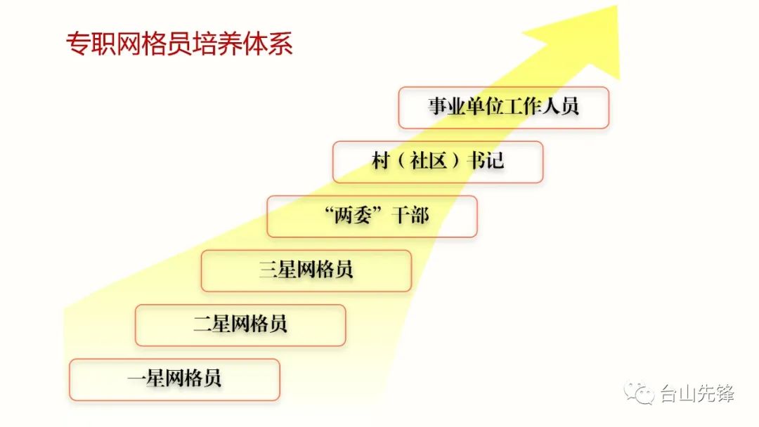 专职网格员培养体系,就是“一星网格员——二星网格员——三星网格员——‘两委’干部——村(社区)书记——事业单位工作人员”。优秀的网格员将纳入村(社区)“两委”后备干部队伍管理,村(社区)“两委”干部出现空缺时,优先推荐其进入村(社区)“两委”班子。台山还畅通优秀村(社区)党组织书记进入事业单位通道。