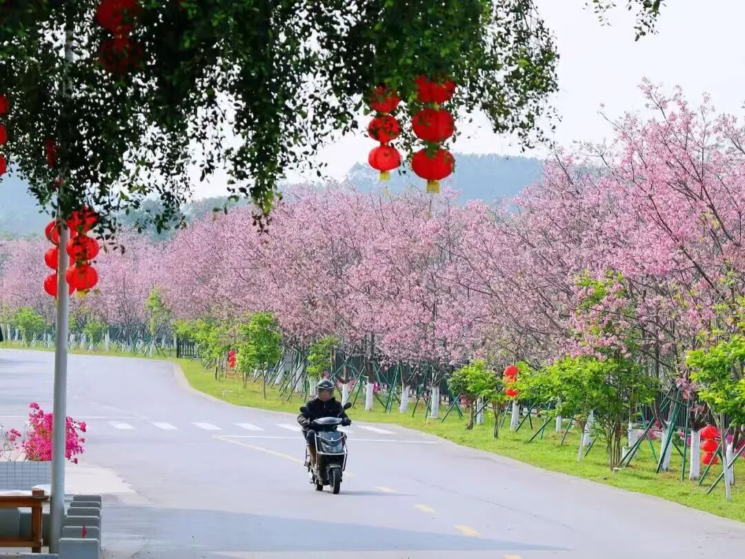 城西村充分发动海内外热心乡亲捐资超4000万元,打造了1.2公里樱花大道,集中栽植牡丹樱、红粉佳人樱、广州樱等樱花品种,形成连贯而富有季相变化的樱花大道,塑造入口标志性景观。