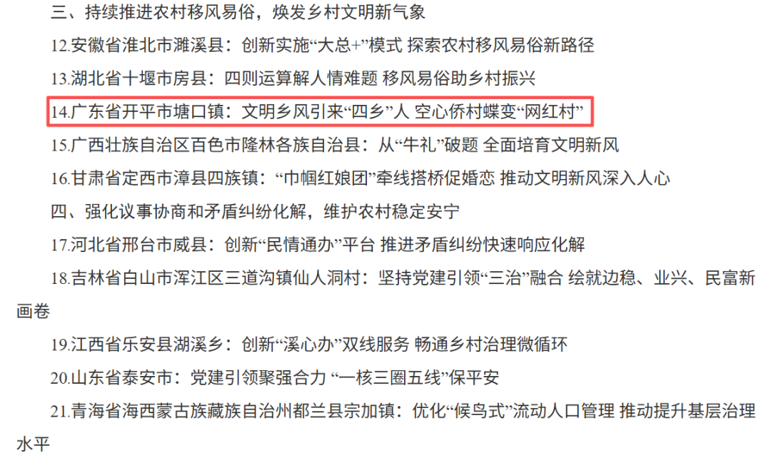近日,中央社会工作部办公厅、农业农村部办公厅联合公布2025年度全国党建引领乡村治理典型案例,“广东省开平市塘口镇文明乡风引来四乡人 空心侨村蝶变网红村”成功入选推进农村移风易俗方面典型案例,是广东省唯一入选案例,也成为广东乡村治理创新实践的又一标杆。