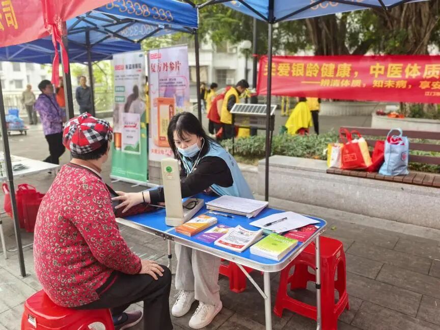 社区广场上为长者提供免费体检服务
