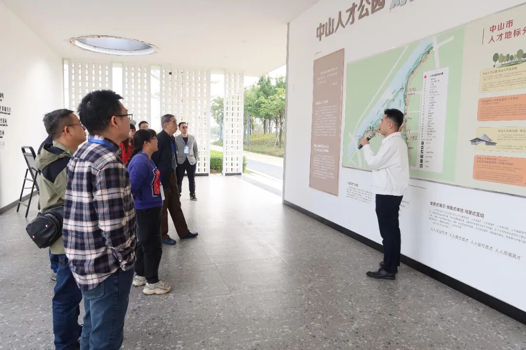 活动首站抵达中山人才公园人才生态馆。作为广东省首个地级市人才主题公园的核心载体,生态馆内设人才服务厅、路演厅、会客厅、研修室等多功能空间,全面展现了中山在人才服务、成果展示与交流互动方面的系统布局。中共中山市委组织部人才事务中心主任张西亲临现场,与参访人才进行了深入交流,详细阐述了中山“人才生态”的构建理念与运营实践。其专业而充满温度的人才服务体系设计,给在场人才留下了深刻印象。