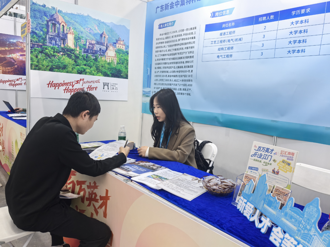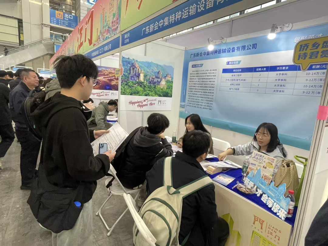 近日,“百万英才汇南粤”大型综合招聘会在深圳福田会展中心隆重举行。一支由新会区内11家重点企业组成的“引才团”,携涵盖新材料、智能制造等关键领域、最高年薪达50万以上的55个优质岗位精准进驻,向五湖四海毕业生们抛出橄榄枝。